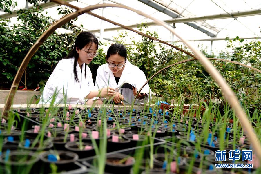 上海植物園科研人員程琳(左)、張蕾蕾在溫室觀察記錄花菖蒲新品種生長情況(2020年6月5日攝)。新華社記者 張建松 攝